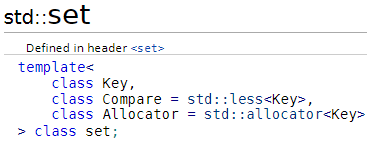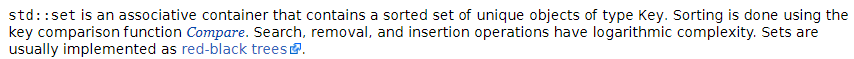 std::set유형의 고유한 개체의 정렬된 집합을 포함하는 연관 컨테이너입니다 Key. 정렬은 키 비교 기능 Compare 를 사용하여 수행됩니다 . 검색, 제거 및 삽입 작업에는 로그 복잡성이 있습니다. 세트는 일반적으로 레드-블랙 트리 로 구현됩니다.