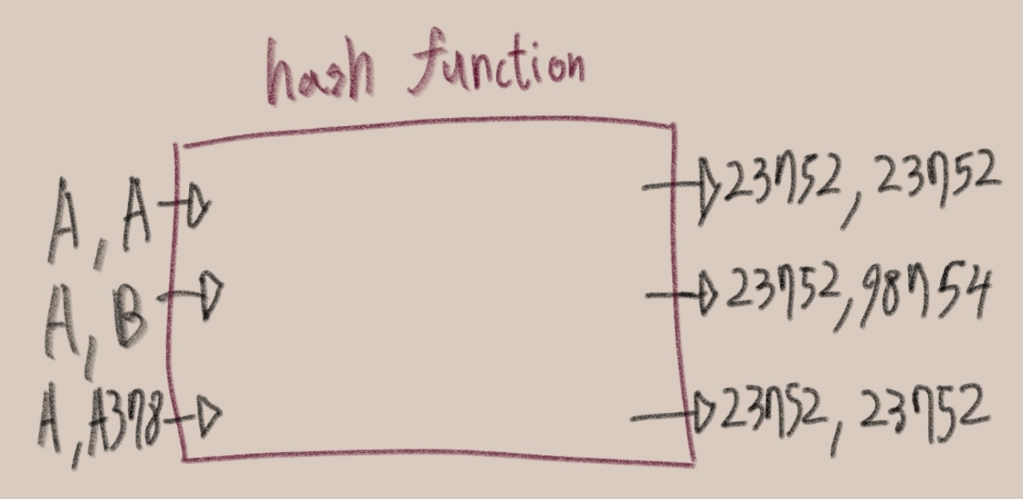 가끔 다른 인풋값이 서로 hash 값이 같을 때가 있는데 이러한 경우는 매우 낮다.