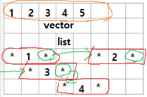 vector는 연속되게 저장된다 하지만 list는 3개씩 떨어진 상태로 저장된다.