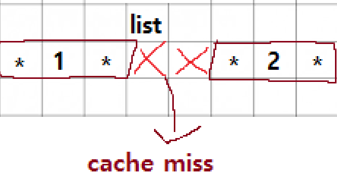 find를 하게 되면 vector에서는 1부터 4까지 하나씩 움직이며 찾게 되고 움직인 뒤 그 메모리는 캐시 된다 그런데 list는 떨어진 상태로 존재하기 때문에 1을 찾고 캐시를 하고 캐쉬가 캐시 미스가나고 2를 찾고 캐쉬를 하고 캐쉬미스가 되고 하는 과정을 거치게 된다.
